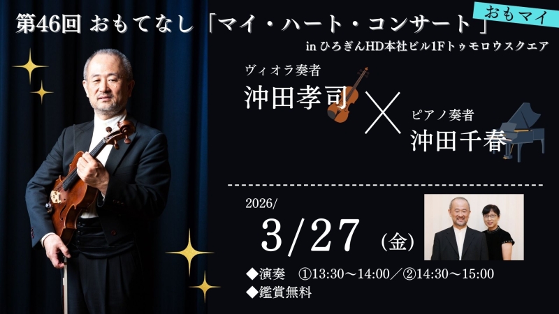 広島を中心に幅広く活躍する、ヴィオラ奏者・沖田孝司様とピアノ奏者・沖田千春様を迎え開催致します。